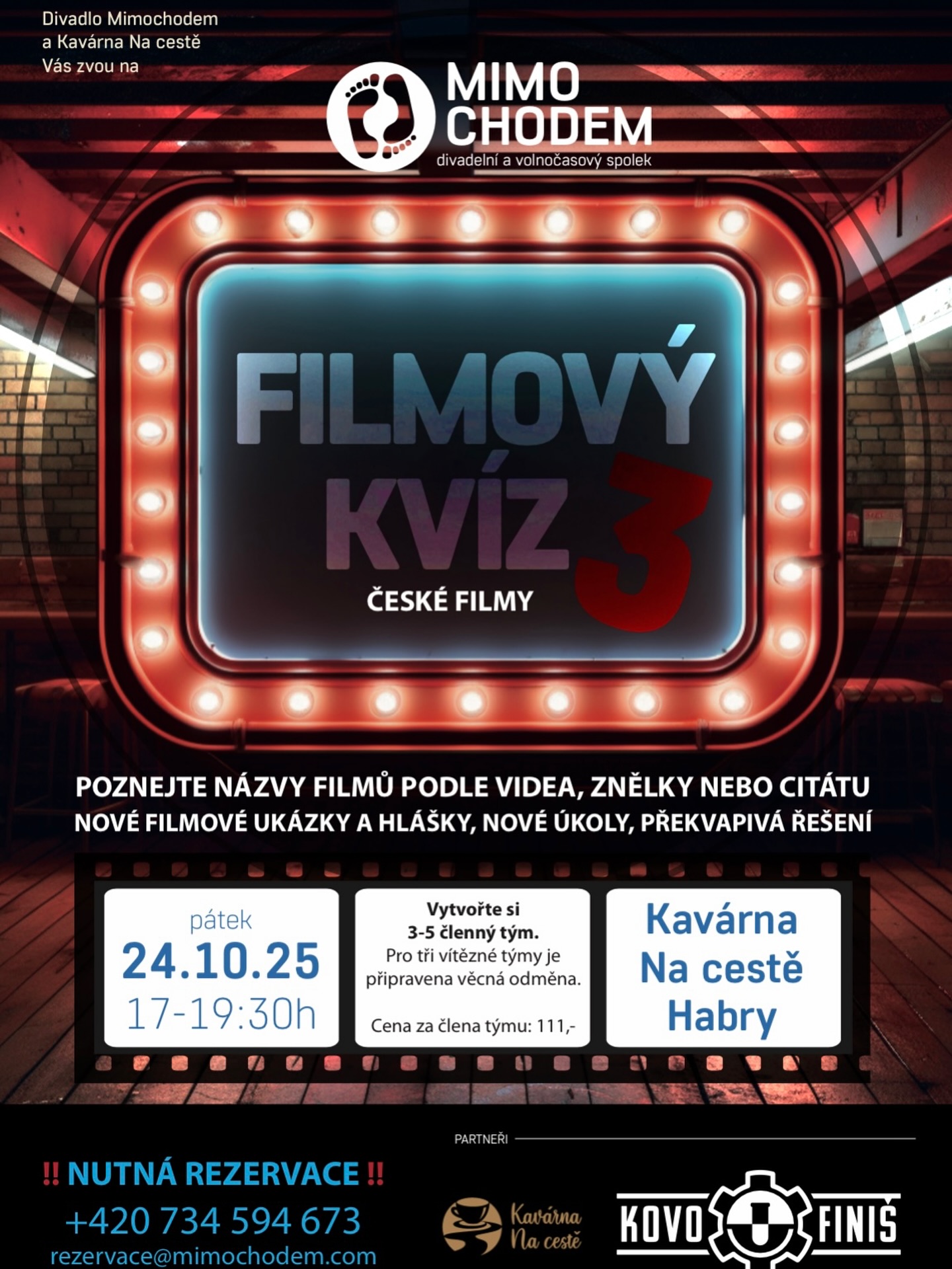 Kvíz se uskuteční v pátek 24. 10. 2025 od 17.00 v Kavárně Na cestě, je nutná rezervace míst předem na tel.: 734 594 673 nebo na e-mailu: rezervace@mimochodem.com