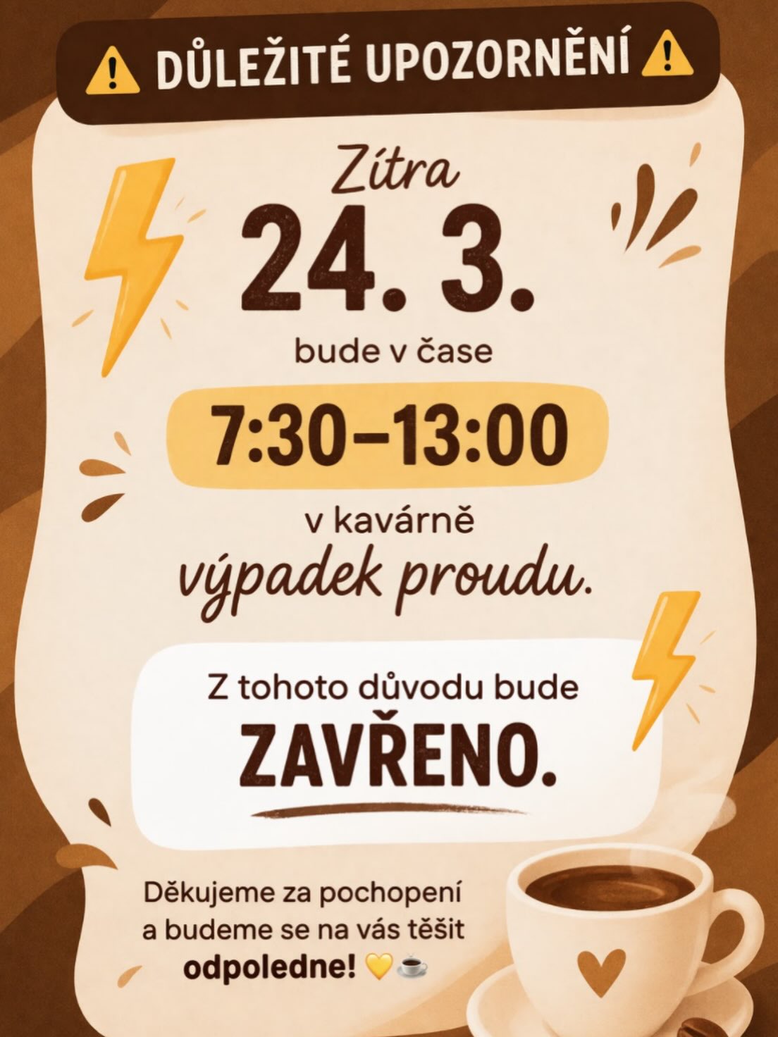 Ve středu 11. 3. v čase 8:00 – 17:00 bude v kavárně omezený sortiment z důvodu odstávky pitné vody. Děkujeme za pochopení.